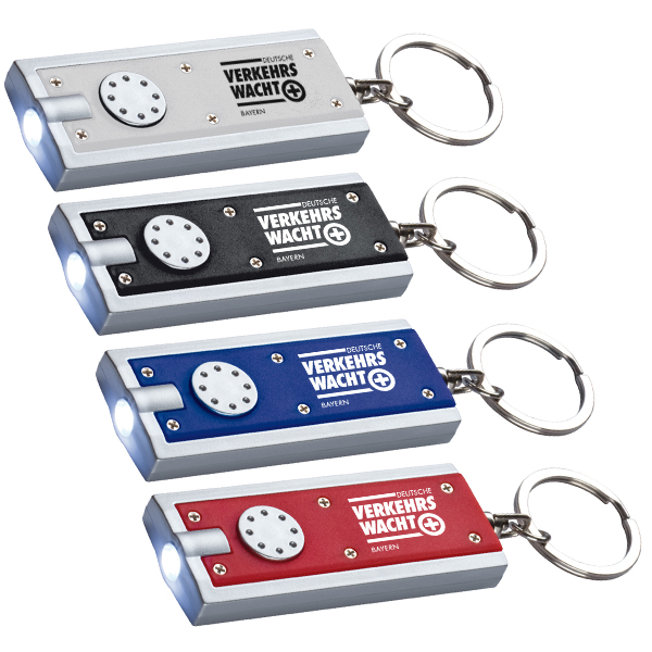 Rechteckiger Schlüsselanhänger mit integriertem LED Lämpchen und Schlüsselring aus Metall. Zwei Knopfzellen sind im Lieferumfang bereits enthalten. Ihre Werbung drucken wir auf die Seite gegenüber des Druckknopfes.