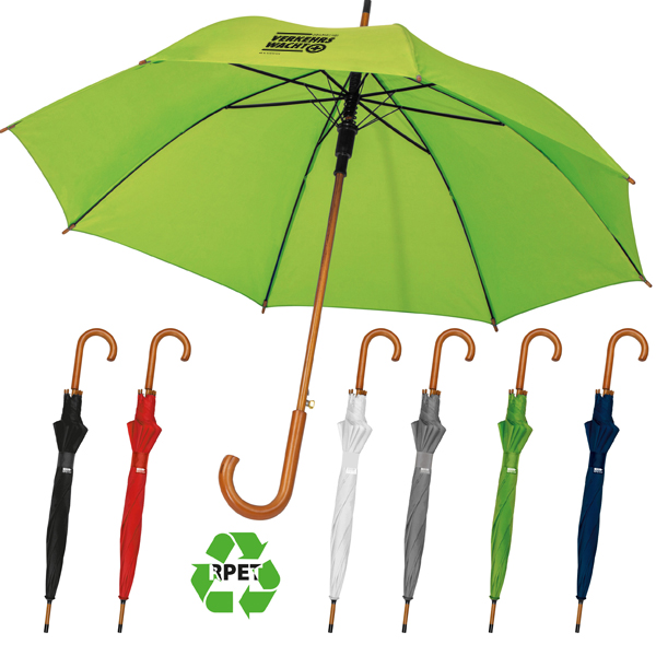 Automatik Regenschirm aus 190T Polyester mit einem Stock aus Metall und einem Holzgriff. Erhältlich in verschiedenen Farben.