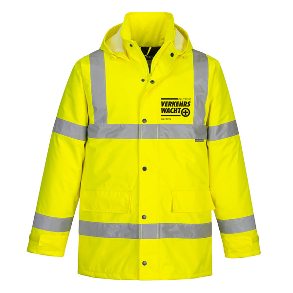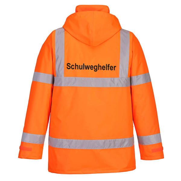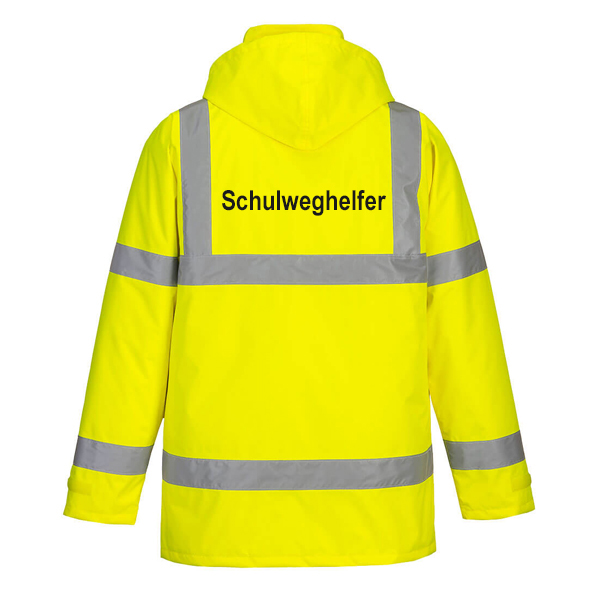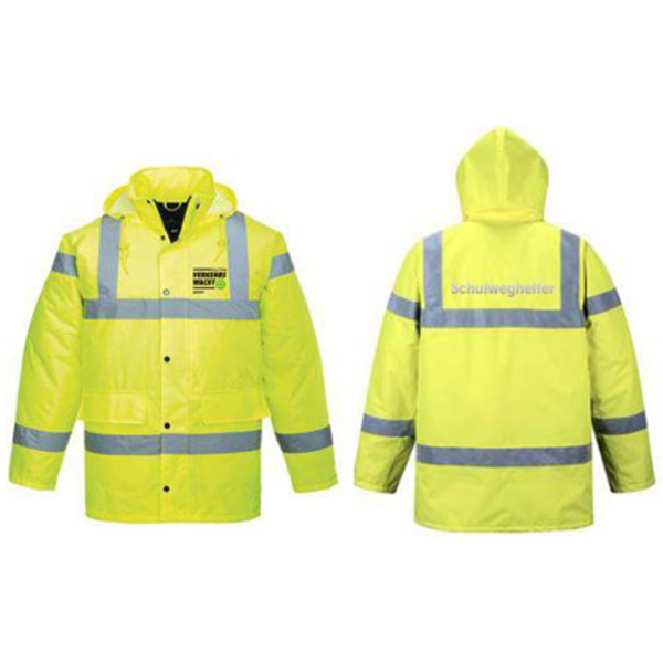 Schulweghelferjacke mit Reflektorstreifen quer und längs auf Vorder- und Rückseite, Full Zip und Druckknopfblende, Innen- und Seitentasche